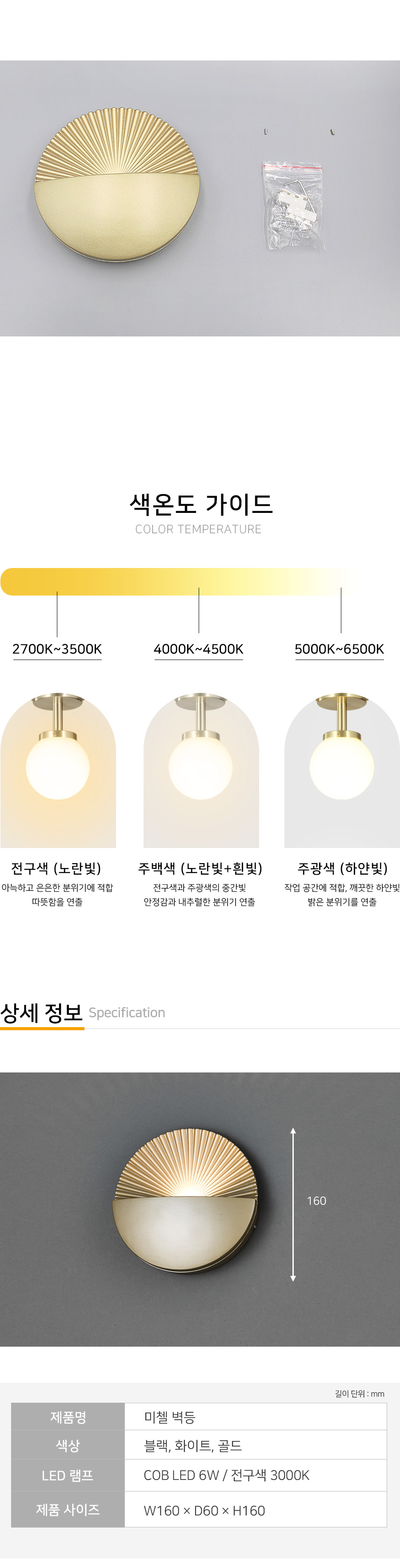 램프 COB LED 6W (전구색 3000K) 사이즈 W160*D60*H160